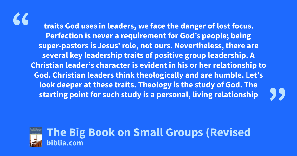 traits God uses in leaders, we face the danger of lost focus. Perfection is never a requirement for God’s people; being super-pastors is Jesus’ role, not ours. Nevertheless, there are several key leadership traits of positive group leadership. A Christian leader’s character is evident in his or her relationship to God. Christian leaders think theologically and are humble. Let’s look deeper at these traits. Theology is the study of God. The starting point for such study is a personal, living relationship