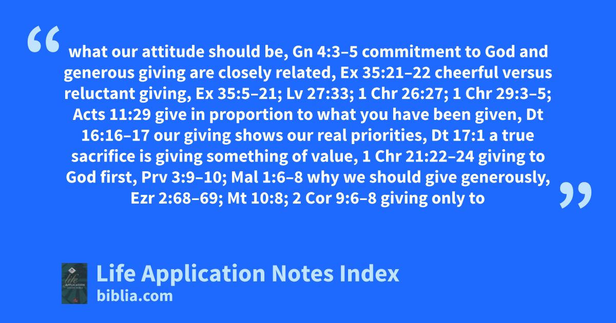 what our attitude should be, Gn 4:3–5 commitment to God and generous giving are closely related, Ex 35:21–22 cheerful versus reluctant giving, Ex 35:5–21; Lv 27:33; 1 Chr 26:27; 1 Chr 29:3–5; Acts 11:29 give in proportion to what you have been given, Dt 16:16–17 our giving shows our real priorities, Dt 17:1 a true sacrifice is giving something of value, 1 Chr 21:22–24 giving to God first, Prv 3:9–10; Mal 1:6–8 why we should give generously, Ezr 2:68–69; Mt 10:8; 2 Cor 9:6–8 giving only to
