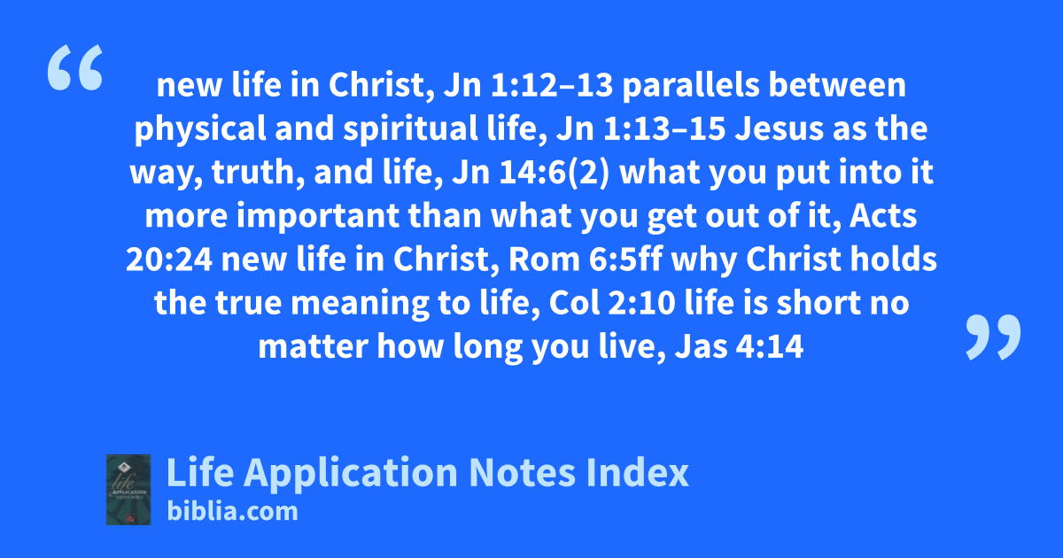 new life in Christ, Jn 1:12–13 parallels between physical and spiritual life, Jn 1:13–15 Jesus as the way, truth, and life, Jn 14:6(2) what you put into it more important than what you get out of it, Acts 20:24 new life in Christ, Rom 6:5ff why Christ holds the true meaning to life, Col 2:10 life is short no matter how long you live, Jas 4:14