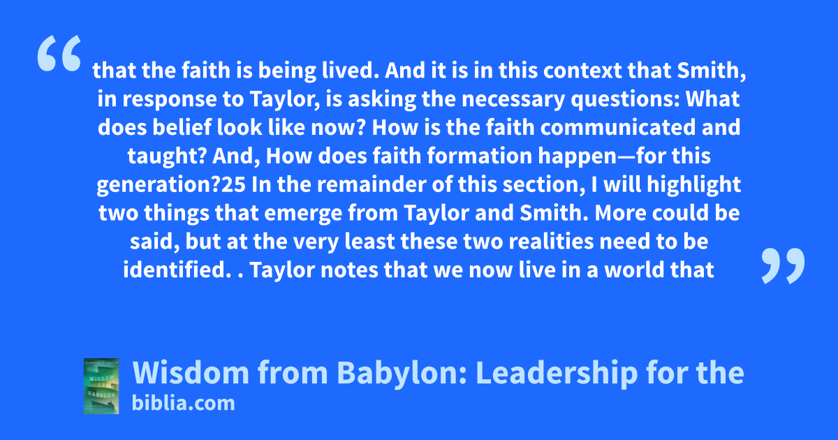 that the faith is being lived. And it is in this context that Smith, in response to Taylor, is asking the necessary questions: What does belief look like now? How is the faith communicated and taught? And, How does faith formation happen—for this generation?25 In the remainder of this section, I will highlight two things that emerge from Taylor and Smith. More could be said, but at the very least these two realities need to be identified. . Taylor notes that we now live in a world that