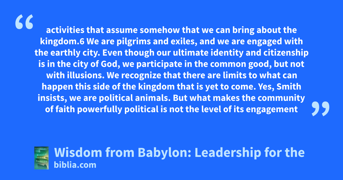 activities that assume somehow that we can bring about the kingdom.6 We are pilgrims and exiles, and we are engaged with the earthly city. Even though our ultimate identity and citizenship is in the city of God, we participate in the common good, but not with illusions. We recognize that there are limits to what can happen this side of the kingdom that is yet to come. Yes, Smith insists, we are political animals. But what makes the community of faith powerfully political is not the level of its engagement