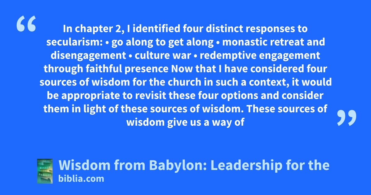 In chapter 2, I identified four distinct responses to secularism: • go along to get along • monastic retreat and disengagement • culture war • redemptive engagement through faithful presence Now that I have considered four sources of wisdom for the church in such a context, it would be appropriate to revisit these four options and consider them in light of these sources of wisdom. These sources of wisdom give us a way of