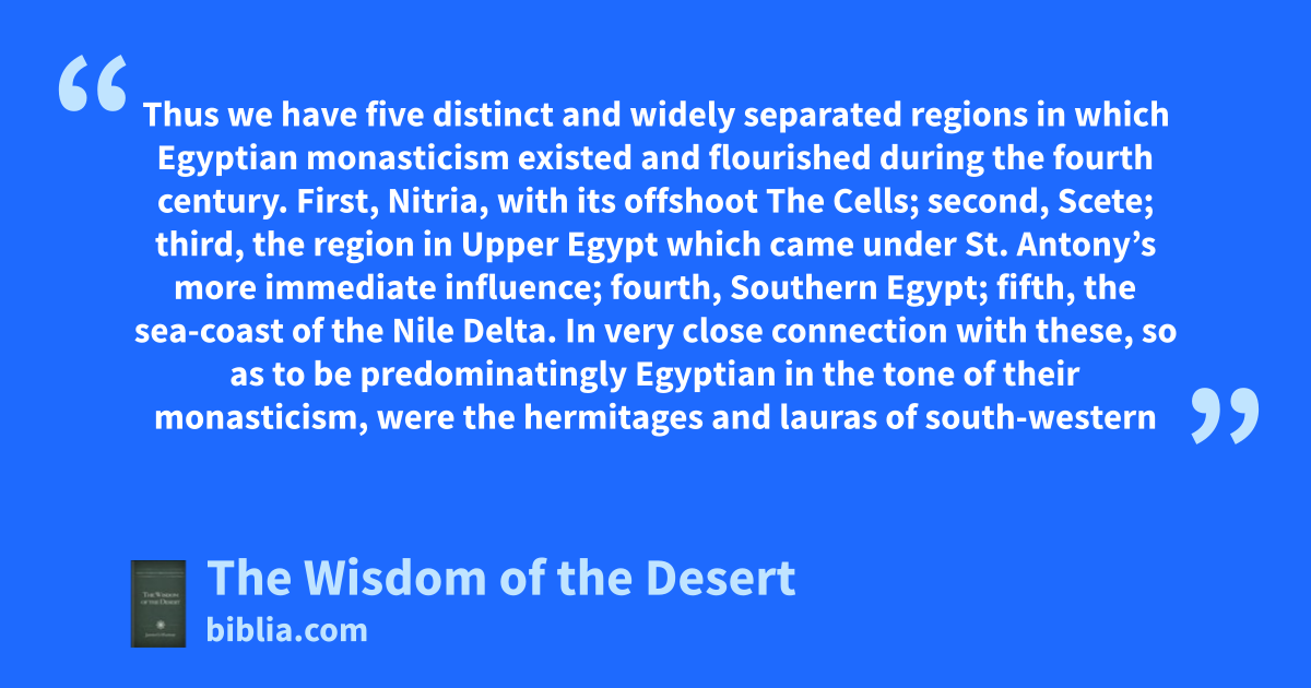 Thus we have five distinct and widely separated regions in which Egyptian monasticism existed and flourished during the fourth century. First, Nitria, with its offshoot The Cells; second, Scete; third, the region in Upper Egypt which came under St. Antony’s more immediate influence; fourth, Southern Egypt; fifth, the sea-coast of the Nile Delta. In very close connection with these, so as to be predominatingly Egyptian in the tone of their monasticism, were the hermitages and lauras of south-western