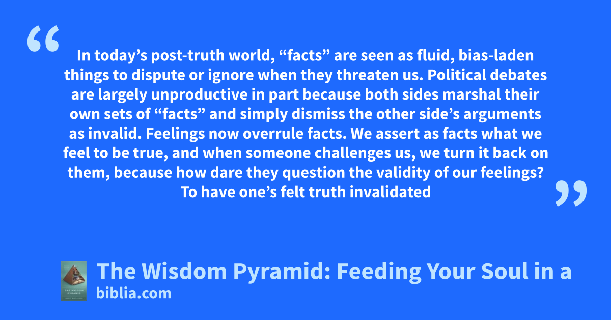 In today’s post-truth world, “facts” are seen as fluid, bias-laden things to dispute or ignore when they threaten us. Political debates are largely unproductive in part because both sides marshal their own sets of “facts” and simply dismiss the other side’s arguments as invalid. Feelings now overrule facts. We assert as facts what we feel to be true, and when someone challenges us, we turn it back on them, because how dare they question the validity of our feelings? To have one’s felt truth invalidated