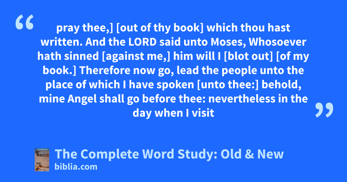 pray thee,] [out of thy book] which thou hast written. And the LORD said unto Moses, Whosoever hath sinned [against me,] him will I [blot out] [of my book.] Therefore now go, lead the people unto the place of which I have spoken [unto thee:] behold, mine Angel shall go before thee: nevertheless in the day when I visit