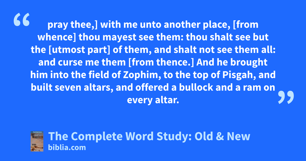 pray thee,] with me unto another place, [from whence] thou mayest see them: thou shalt see but the [utmost part] of them, and shalt not see them all: and curse me them [from thence.] And he brought him into the field of Zophim, to the top of Pisgah, and built seven altars, and offered a bullock and a ram on every altar.