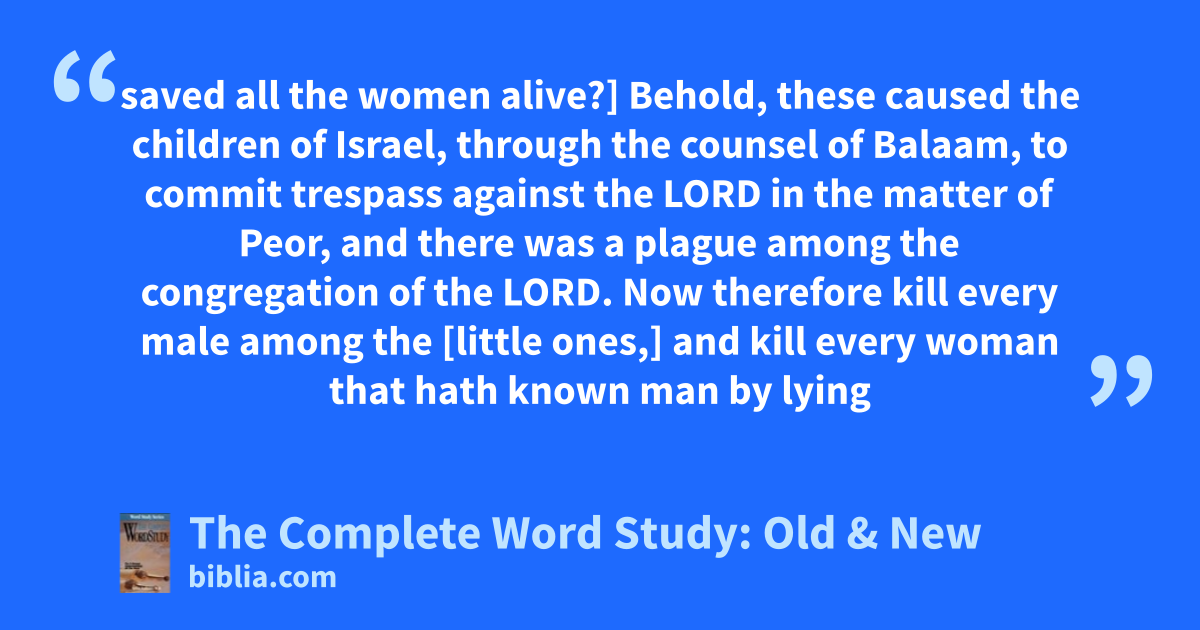 saved all the women alive?] Behold, these caused the children of Israel, through the counsel of Balaam, to commit trespass against the LORD in the matter of Peor, and there was a plague among the congregation of the LORD. Now therefore kill every male among the [little ones,] and kill every woman that hath known man by lying