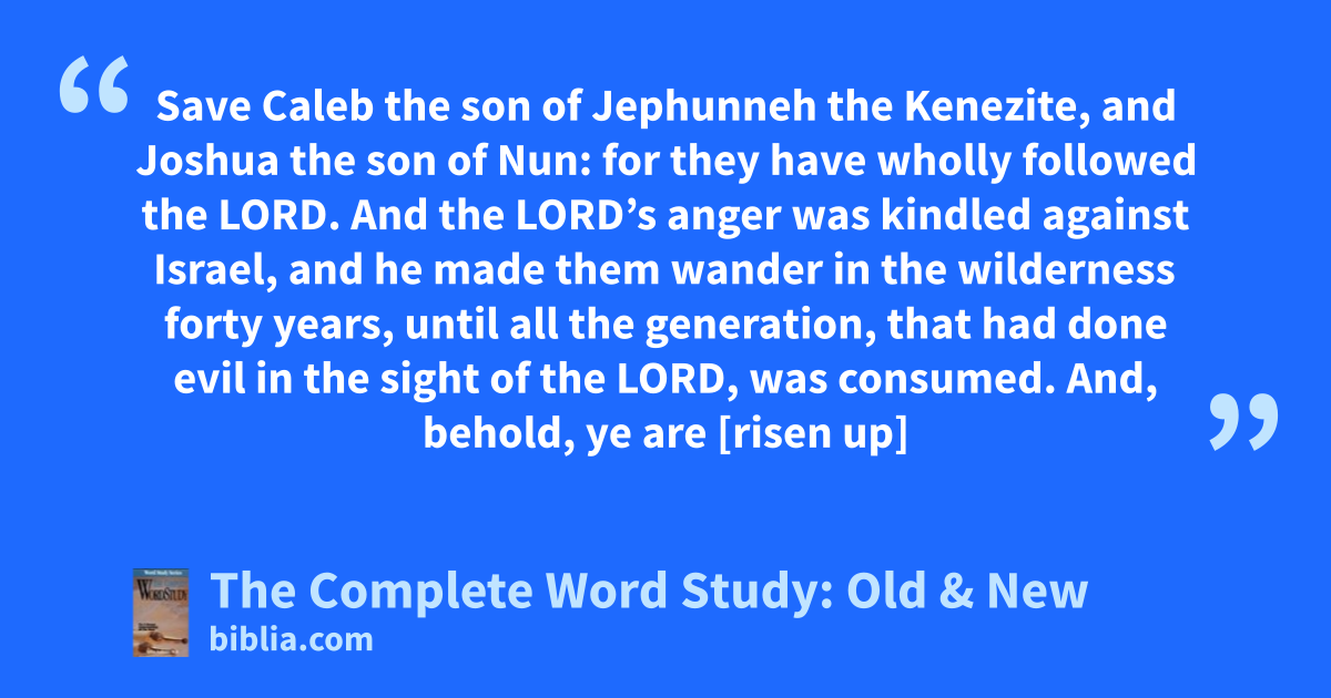 Save Caleb the son of Jephunneh the Kenezite, and Joshua the son of Nun: for they have wholly followed the LORD. And the LORD’s anger was kindled against Israel, and he made them wander in the wilderness forty years, until all the generation, that had done evil in the sight of the LORD, was consumed. And, behold, ye are [risen up]