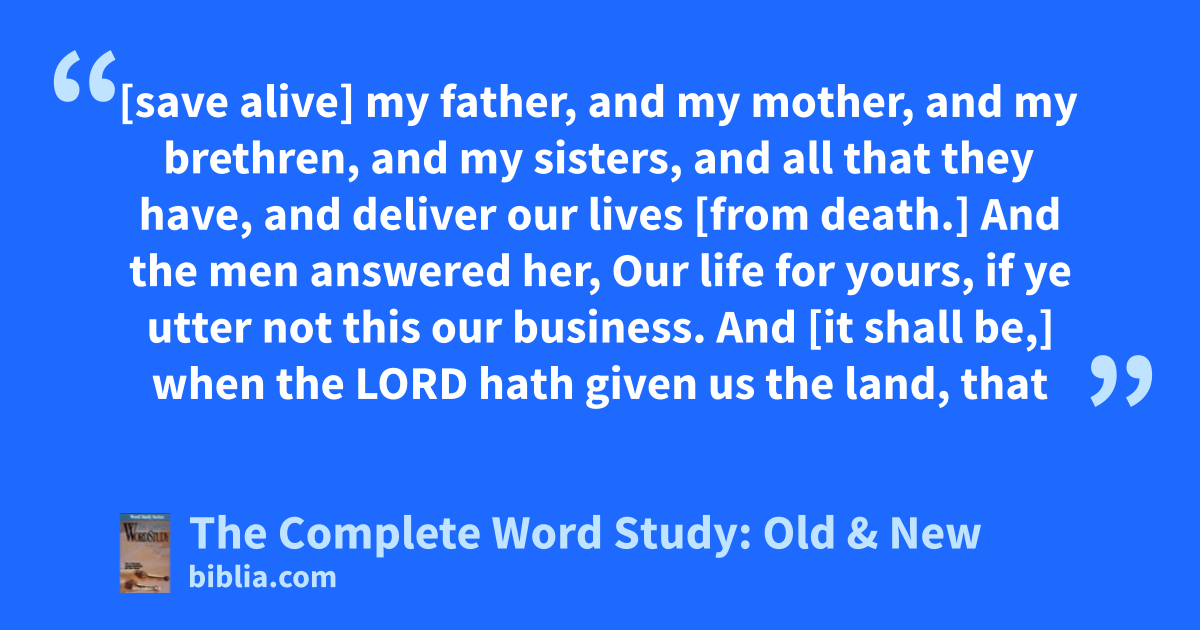 [save alive] my father, and my mother, and my brethren, and my sisters, and all that they have, and deliver our lives [from death.] And the men answered her, Our life for yours, if ye utter not this our business. And [it shall be,] when the LORD hath given us the land, that
