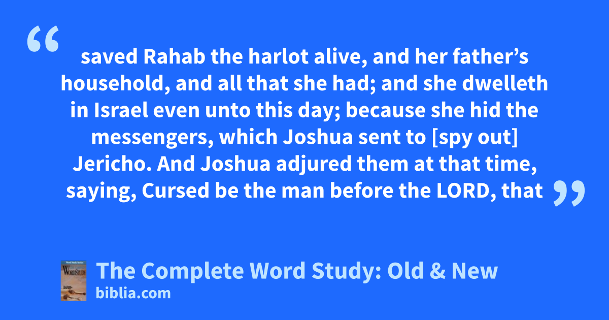 saved Rahab the harlot alive, and her father’s household, and all that she had; and she dwelleth in Israel even unto this day; because she hid the messengers, which Joshua sent to [spy out] Jericho. And Joshua adjured them at that time, saying, Cursed be the man before the LORD, that