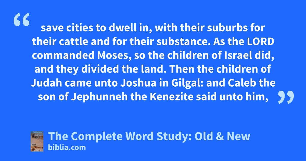 save cities to dwell in, with their suburbs for their cattle and for their substance. As the LORD commanded Moses, so the children of Israel did, and they divided the land. Then the children of Judah came unto Joshua in Gilgal: and Caleb the son of Jephunneh the Kenezite said unto him,