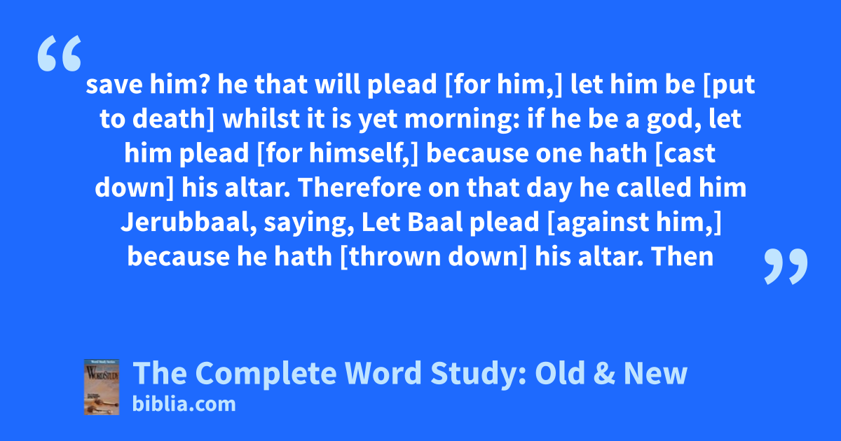 save him? he that will plead [for him,] let him be [put to death] whilst it is yet morning: if he be a god, let him plead [for himself,] because one hath [cast down] his altar. Therefore on that day he called him Jerubbaal, saying, Let Baal plead [against him,] because he hath [thrown down] his altar. Then