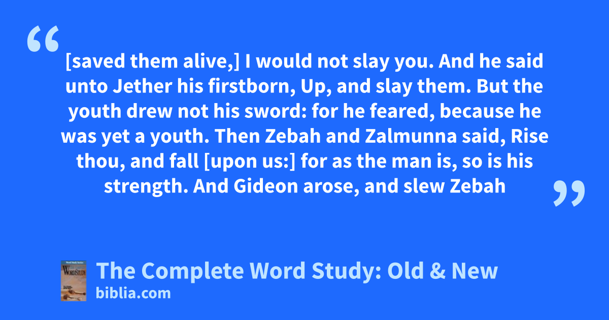 [saved them alive,] I would not slay you. And he said unto Jether his firstborn, Up, and slay them. But the youth drew not his sword: for he feared, because he was yet a youth. Then Zebah and Zalmunna said, Rise thou, and fall [upon us:] for as the man is, so is his strength. And Gideon arose, and slew Zebah