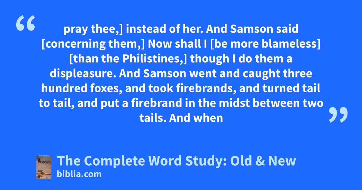 pray thee,] instead of her. And Samson said [concerning them,] Now shall I [be more blameless] [than the Philistines,] though I do them a displeasure. And Samson went and caught three hundred foxes, and took firebrands, and turned tail to tail, and put a firebrand in the midst between two tails. And when