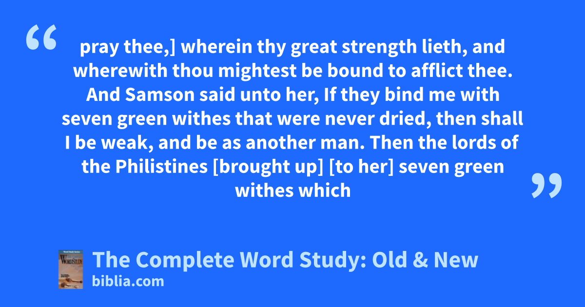 pray thee,] wherein thy great strength lieth, and wherewith thou mightest be bound to afflict thee. And Samson said unto her, If they bind me with seven green withes that were never dried, then shall I be weak, and be as another man. Then the lords of the Philistines [brought up] [to her] seven green withes which