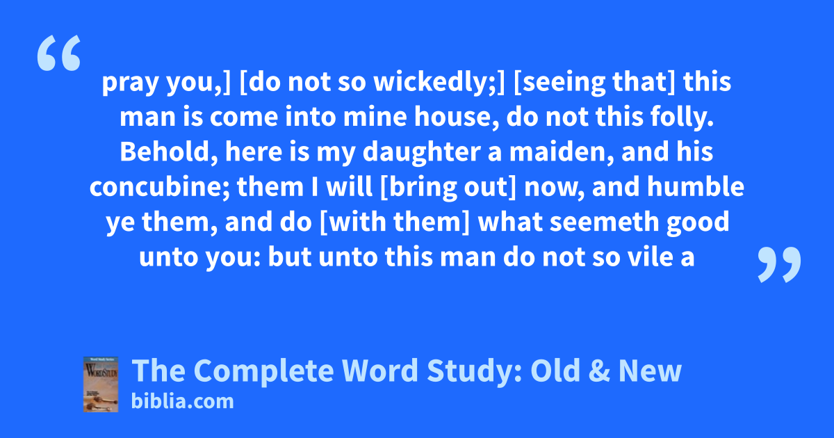 pray you,] [do not so wickedly;] [seeing that] this man is come into mine house, do not this folly. Behold, here is my daughter a maiden, and his concubine; them I will [bring out] now, and humble ye them, and do [with them] what seemeth good unto you: but unto this man do not so vile a