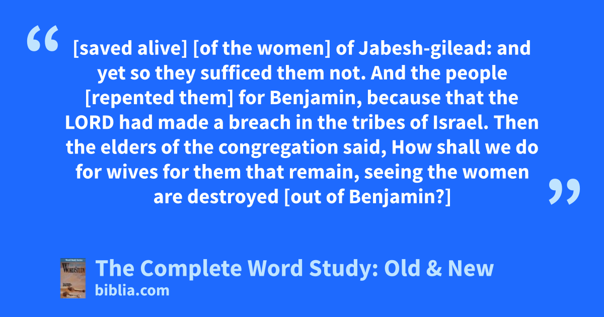 [saved alive] [of the women] of Jabesh-gilead: and yet so they sufficed them not. And the people [repented them] for Benjamin, because that the LORD had made a breach in the tribes of Israel. Then the elders of the congregation said, How shall we do for wives for them that remain, seeing the women are destroyed [out of Benjamin?]