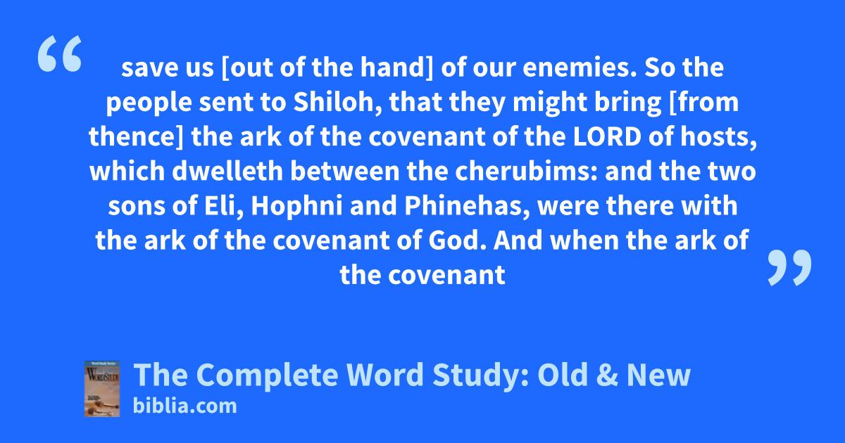 save us [out of the hand] of our enemies. So the people sent to Shiloh, that they might bring [from thence] the ark of the covenant of the LORD of hosts, which dwelleth between the cherubims: and the two sons of Eli, Hophni and Phinehas, were there with the ark of the covenant of God. And when the ark of the covenant