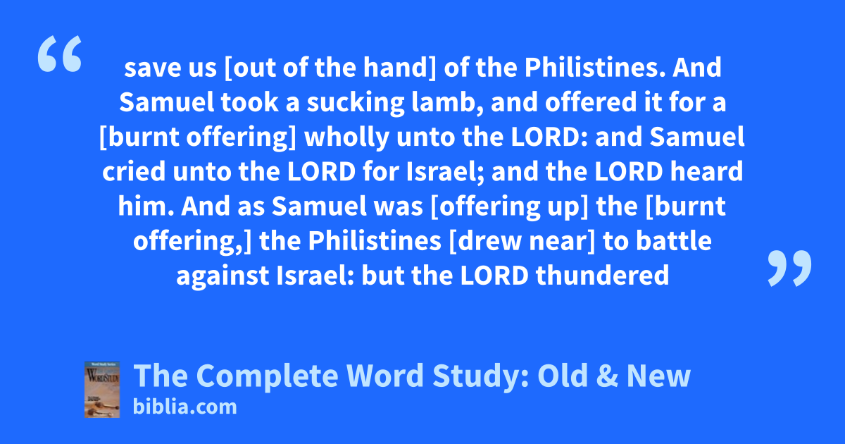 save us [out of the hand] of the Philistines. And Samuel took a sucking lamb, and offered it for a [burnt offering] wholly unto the LORD: and Samuel cried unto the LORD for Israel; and the LORD heard him. And as Samuel was [offering up] the [burnt offering,] the Philistines [drew near] to battle against Israel: but the LORD thundered