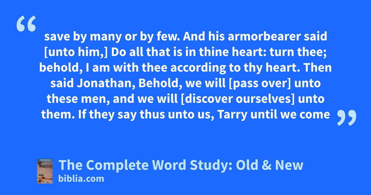 save by many or by few. And his armorbearer said [unto him,] Do all that is in thine heart: turn thee; behold, I am with thee according to thy heart. Then said Jonathan, Behold, we will [pass over] unto these men, and we will [discover ourselves] unto them. If they say thus unto us, Tarry until we come