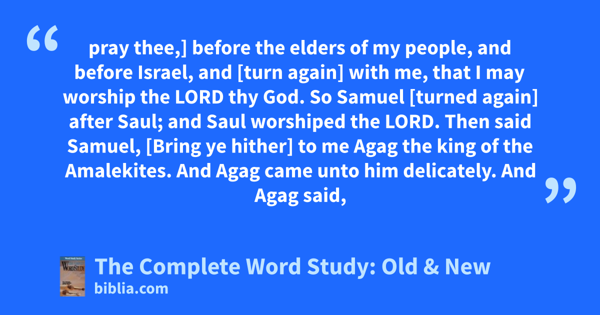 pray thee,] before the elders of my people, and before Israel, and [turn again] with me, that I may worship the LORD thy God. So Samuel [turned again] after Saul; and Saul worshiped the LORD. Then said Samuel, [Bring ye hither] to me Agag the king of the Amalekites. And Agag came unto him delicately. And Agag said,