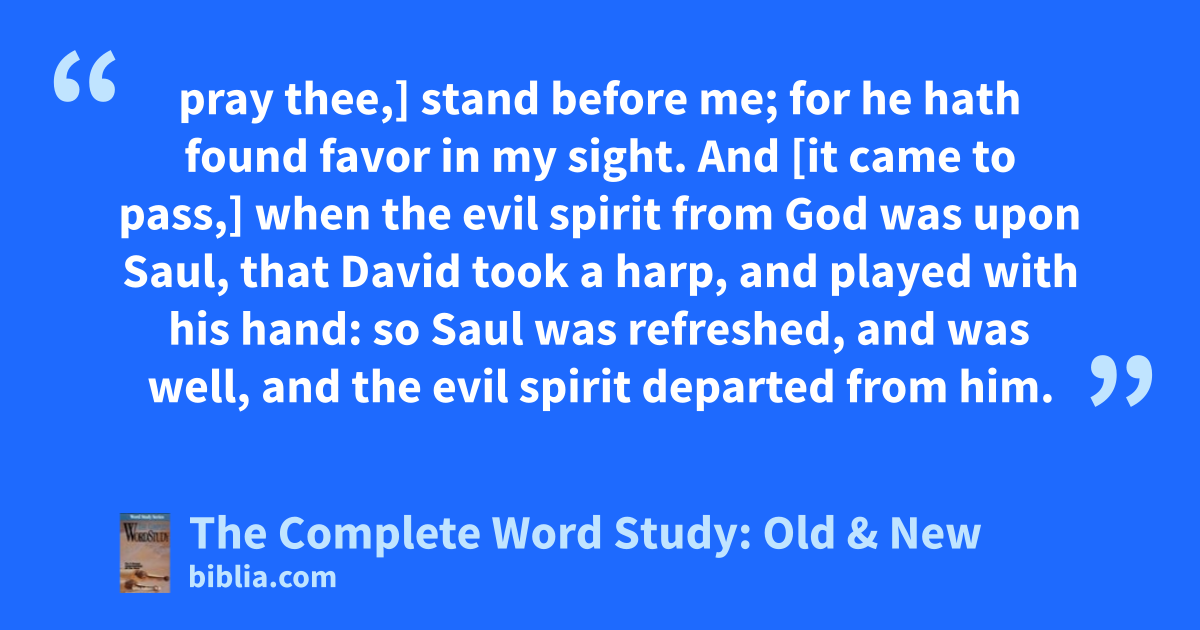 pray thee,] stand before me; for he hath found favor in my sight. And [it came to pass,] when the evil spirit from God was upon Saul, that David took a harp, and played with his hand: so Saul was refreshed, and was well, and the evil spirit departed from him.