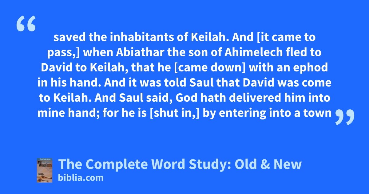 saved the inhabitants of Keilah. And [it came to pass,] when Abiathar the son of Ahimelech fled to David to Keilah, that he [came down] with an ephod in his hand. And it was told Saul that David was come to Keilah. And Saul said, God hath delivered him into mine hand; for he is [shut in,] by entering into a town