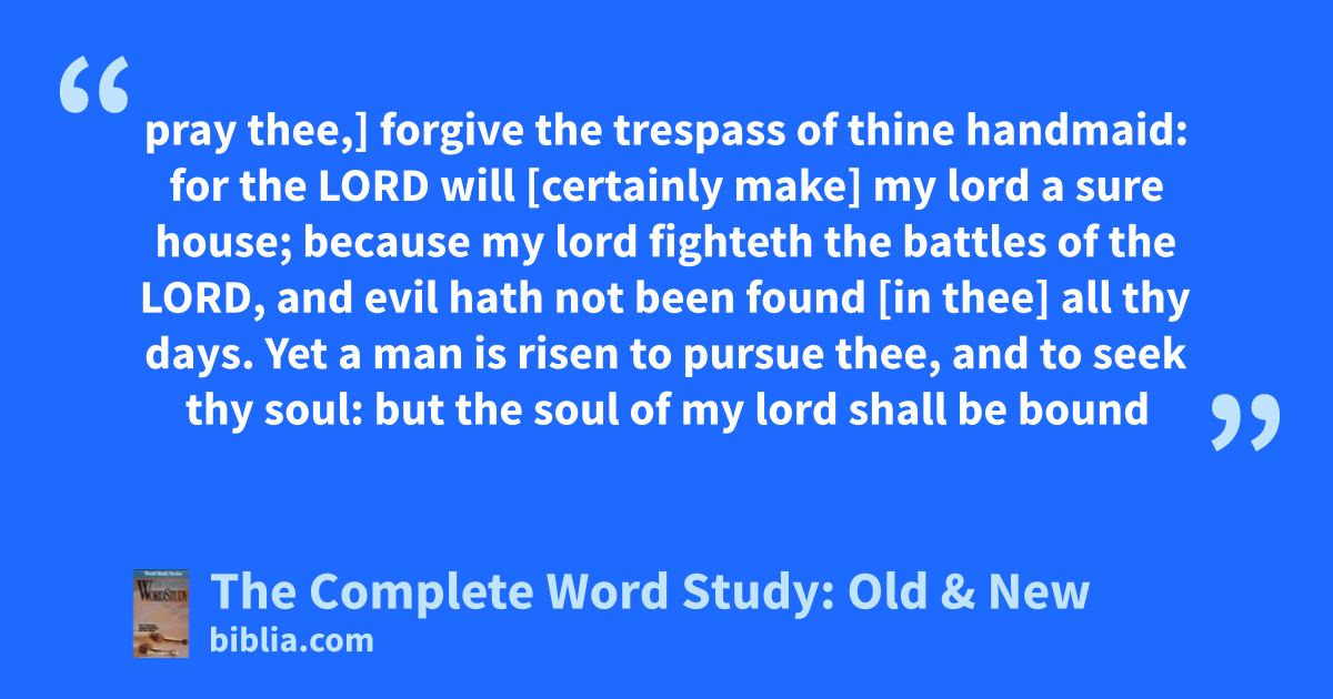 pray thee,] forgive the trespass of thine handmaid: for the LORD will [certainly make] my lord a sure house; because my lord fighteth the battles of the LORD, and evil hath not been found [in thee] all thy days. Yet a man is risen to pursue thee, and to seek thy soul: but the soul of my lord shall be bound