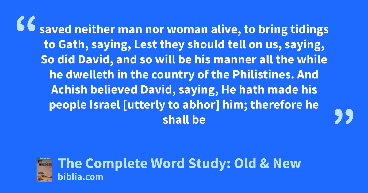 saved neither man nor woman alive, to bring tidings to Gath, saying, Lest they should tell on us, saying, So did David, and so will be his manner all the while he dwelleth in the country of the Philistines. And Achish believed David, saying, He hath made his people Israel [utterly to abhor] him; therefore he shall be
