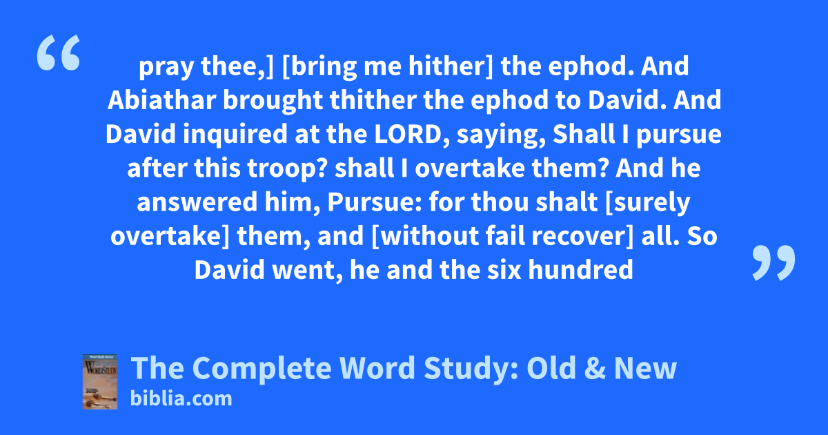 pray thee,] [bring me hither] the ephod. And Abiathar brought thither the ephod to David. And David inquired at the LORD, saying, Shall I pursue after this troop? shall I overtake them? And he answered him, Pursue: for thou shalt [surely overtake] them, and [without fail recover] all. So David went, he and the six hundred