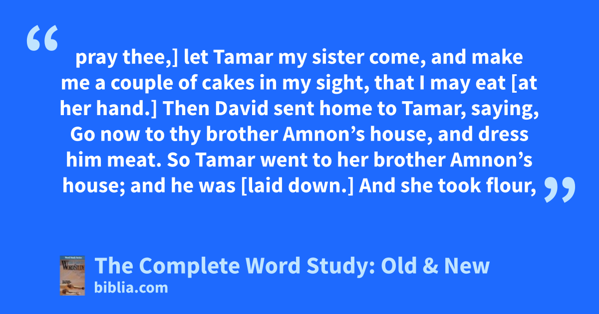 pray thee,] let Tamar my sister come, and make me a couple of cakes in my sight, that I may eat [at her hand.] Then David sent home to Tamar, saying, Go now to thy brother Amnon’s house, and dress him meat. So Tamar went to her brother Amnon’s house; and he was [laid down.] And she took flour,