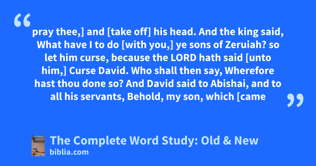 pray thee,] and [take off] his head. And the king said, What have I to do [with you,] ye sons of Zeruiah? so let him curse, because the LORD hath said [unto him,] Curse David. Who shall then say, Wherefore hast thou done so? And David said to Abishai, and to all his servants, Behold, my son, which [came
