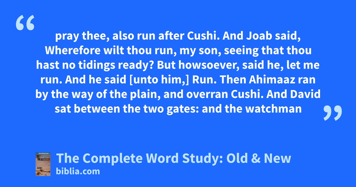 pray thee, also run after Cushi. And Joab said, Wherefore wilt thou run, my son, seeing that thou hast no tidings ready? But howsoever, said he, let me run. And he said [unto him,] Run. Then Ahimaaz ran by the way of the plain, and overran Cushi. And David sat between the two gates: and the watchman