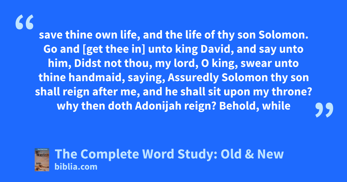 save thine own life, and the life of thy son Solomon. Go and [get thee in] unto king David, and say unto him, Didst not thou, my lord, O king, swear unto thine handmaid, saying, Assuredly Solomon thy son shall reign after me, and he shall sit upon my throne? why then doth Adonijah reign? Behold, while