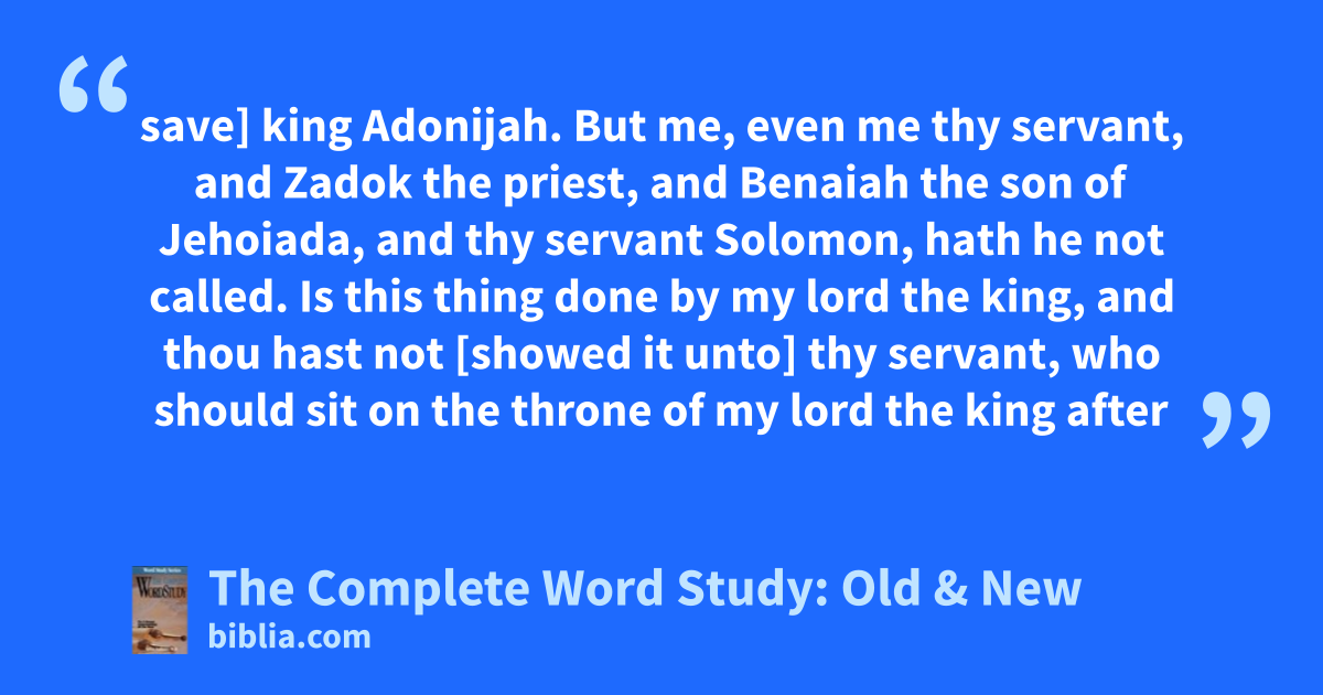 save] king Adonijah. But me, even me thy servant, and Zadok the priest, and Benaiah the son of Jehoiada, and thy servant Solomon, hath he not called. Is this thing done by my lord the king, and thou hast not [showed it unto] thy servant, who should sit on the throne of my lord the king after