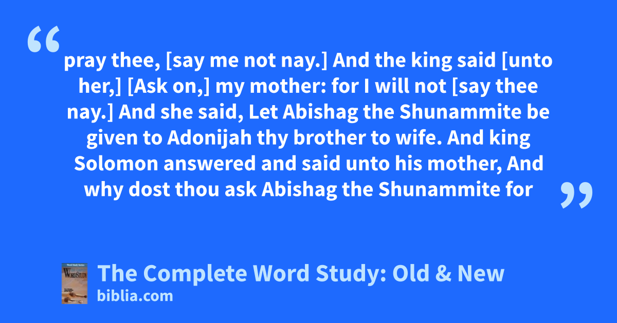 pray thee, [say me not nay.] And the king said [unto her,] [Ask on,] my mother: for I will not [say thee nay.] And she said, Let Abishag the Shunammite be given to Adonijah thy brother to wife. And king Solomon answered and said unto his mother, And why dost thou ask Abishag the Shunammite for
