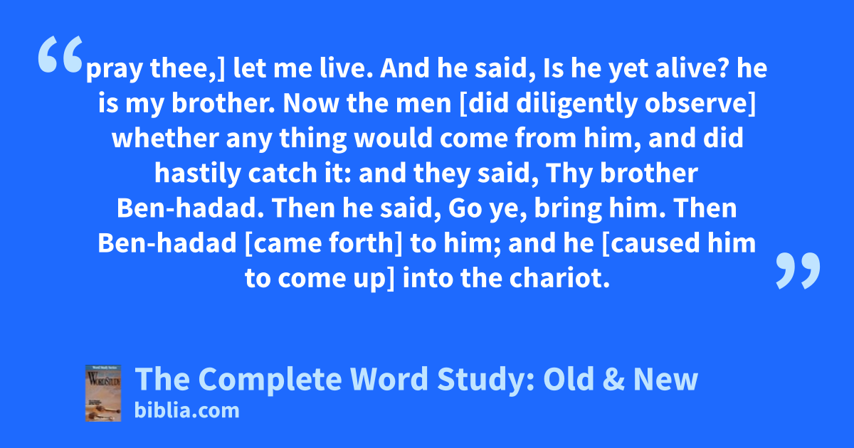 pray thee,] let me live. And he said, Is he yet alive? he is my brother. Now the men [did diligently observe] whether any thing would come from him, and did hastily catch it: and they said, Thy brother Ben-hadad. Then he said, Go ye, bring him. Then Ben-hadad [came forth] to him; and he [caused him to come up] into the chariot.