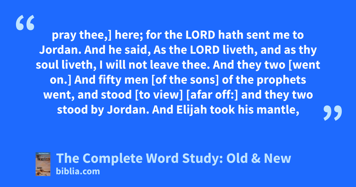 pray thee,] here; for the LORD hath sent me to Jordan. And he said, As the LORD liveth, and as thy soul liveth, I will not leave thee. And they two [went on.] And fifty men [of the sons] of the prophets went, and stood [to view] [afar off:] and they two stood by Jordan. And Elijah took his mantle,