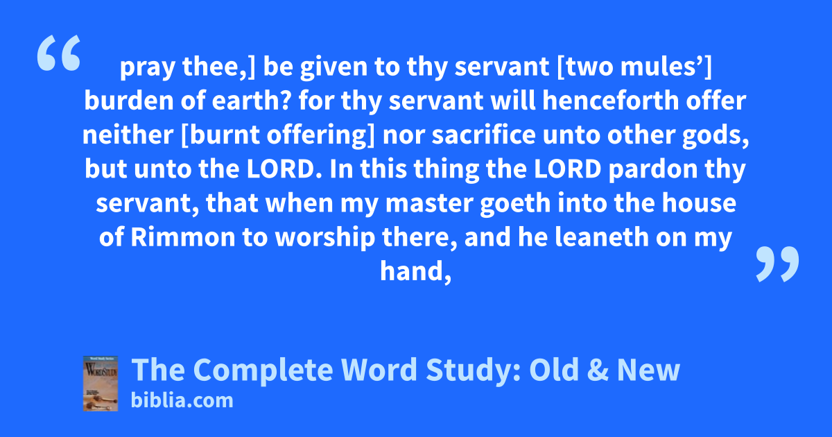 pray thee,] be given to thy servant [two mules’] burden of earth? for thy servant will henceforth offer neither [burnt offering] nor sacrifice unto other gods, but unto the LORD. In this thing the LORD pardon thy servant, that when my master goeth into the house of Rimmon to worship there, and he leaneth on my hand,