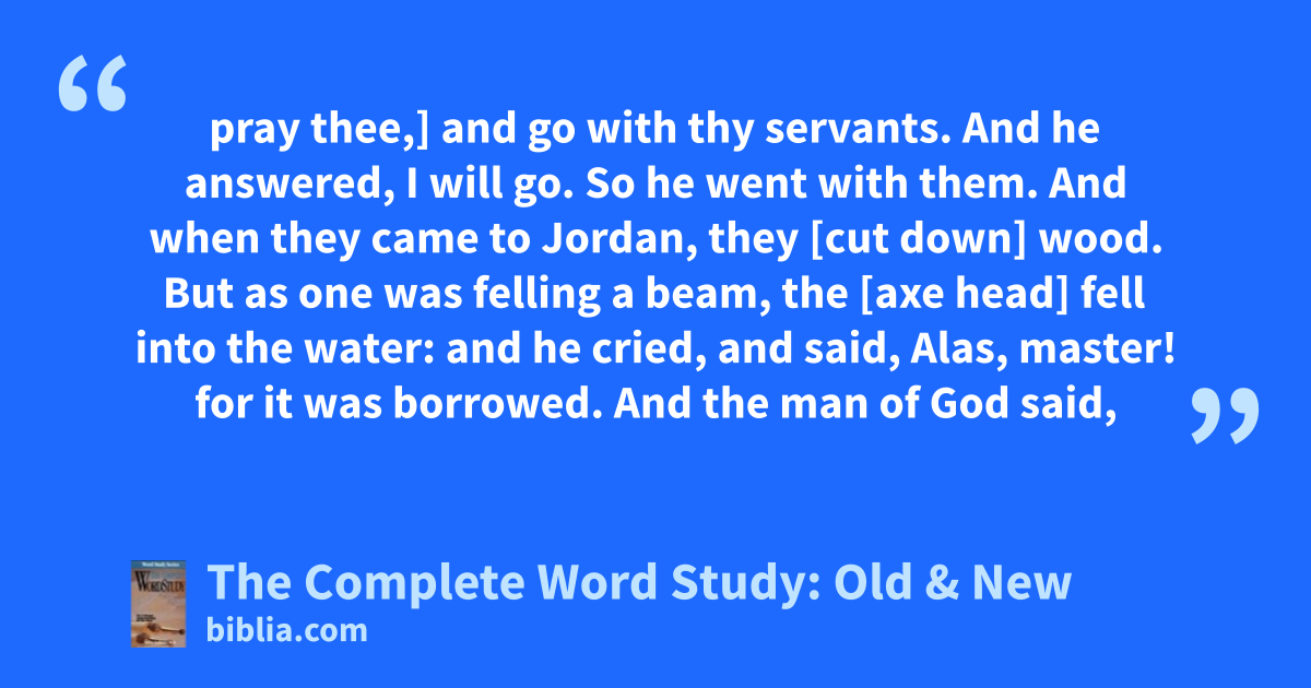 pray thee,] and go with thy servants. And he answered, I will go. So he went with them. And when they came to Jordan, they [cut down] wood. But as one was felling a beam, the [axe head] fell into the water: and he cried, and said, Alas, master! for it was borrowed. And the man of God said,