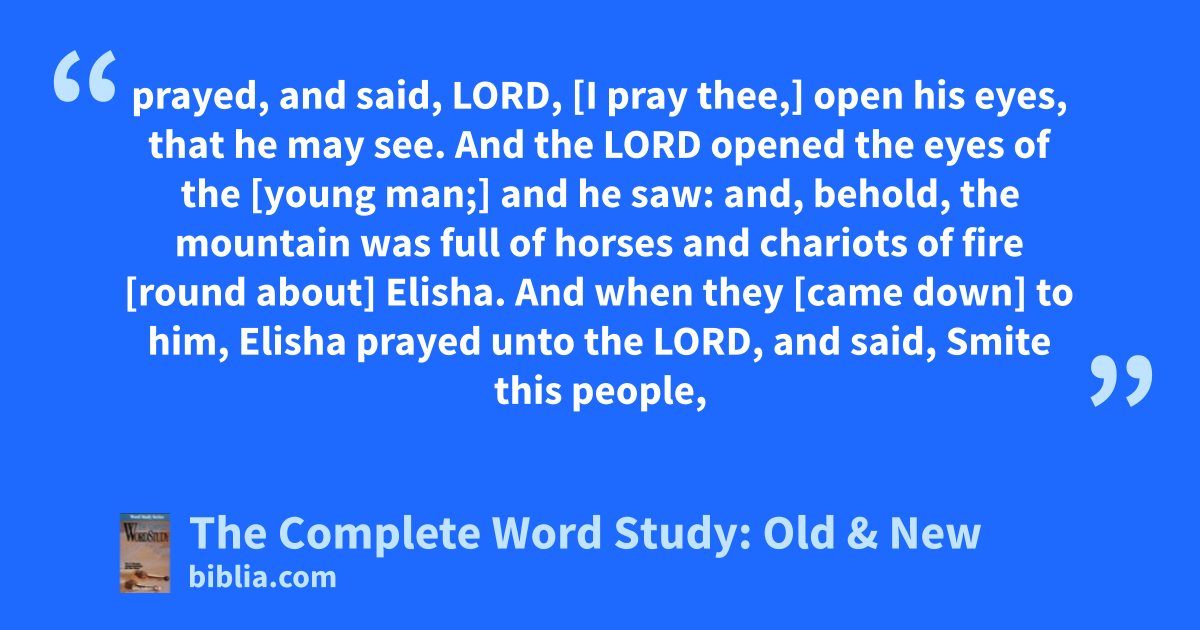 prayed, and said, LORD, [I pray thee,] open his eyes, that he may see. And the LORD opened the eyes of the [young man;] and he saw: and, behold, the mountain was full of horses and chariots of fire [round about] Elisha. And when they [came down] to him, Elisha prayed unto the LORD, and said, Smite this people,