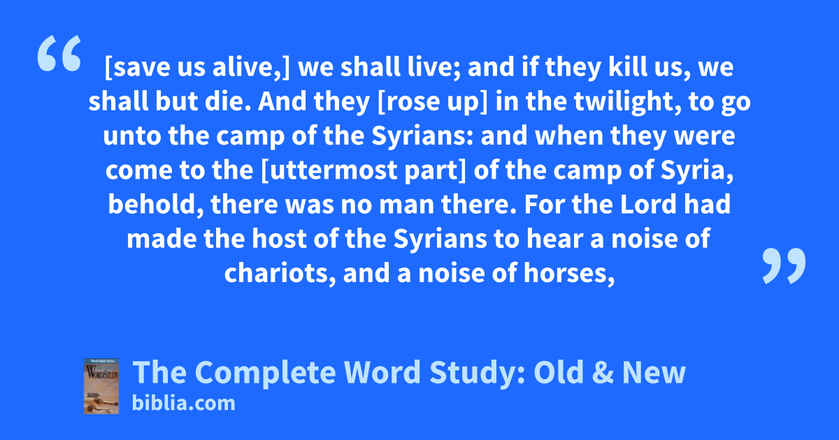 [save us alive,] we shall live; and if they kill us, we shall but die. And they [rose up] in the twilight, to go unto the camp of the Syrians: and when they were come to the [uttermost part] of the camp of Syria, behold, there was no man there. For the Lord had made the host of the Syrians to hear a noise of chariots, and a noise of horses,