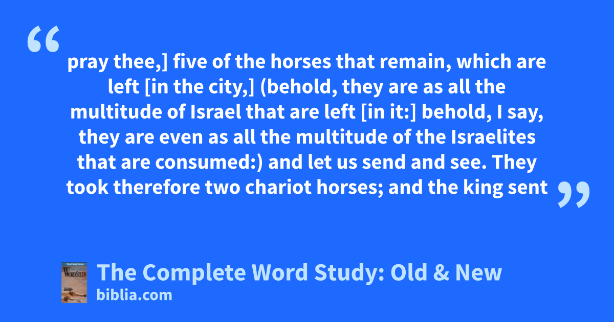 pray thee,] five of the horses that remain, which are left [in the city,] (behold, they are as all the multitude of Israel that are left [in it:] behold, I say, they are even as all the multitude of the Israelites that are consumed:) and let us send and see. They took therefore two chariot horses; and the king sent