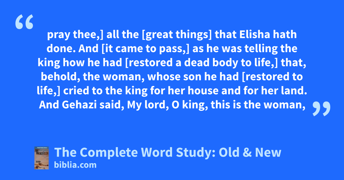 pray thee,] all the [great things] that Elisha hath done. And [it came to pass,] as he was telling the king how he had [restored a dead body to life,] that, behold, the woman, whose son he had [restored to life,] cried to the king for her house and for her land. And Gehazi said, My lord, O king, this is the woman,