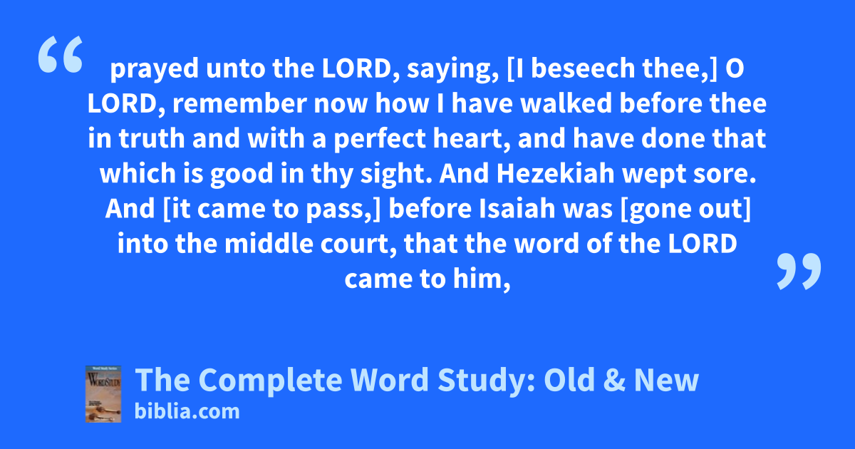 prayed unto the LORD, saying, [I beseech thee,] O LORD, remember now how I have walked before thee in truth and with a perfect heart, and have done that which is good in thy sight. And Hezekiah wept sore. And [it came to pass,] before Isaiah was [gone out] into the middle court, that the word of the LORD came to him,