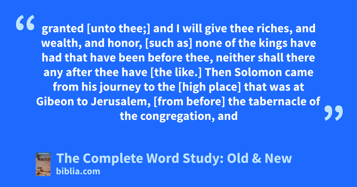 granted [unto thee;] and I will give thee riches, and wealth, and honor, [such as] none of the kings have had that have been before thee, neither shall there any after thee have [the like.] Then Solomon came from his journey to the [high place] that was at Gibeon to Jerusalem, [from before] the tabernacle of the congregation, and