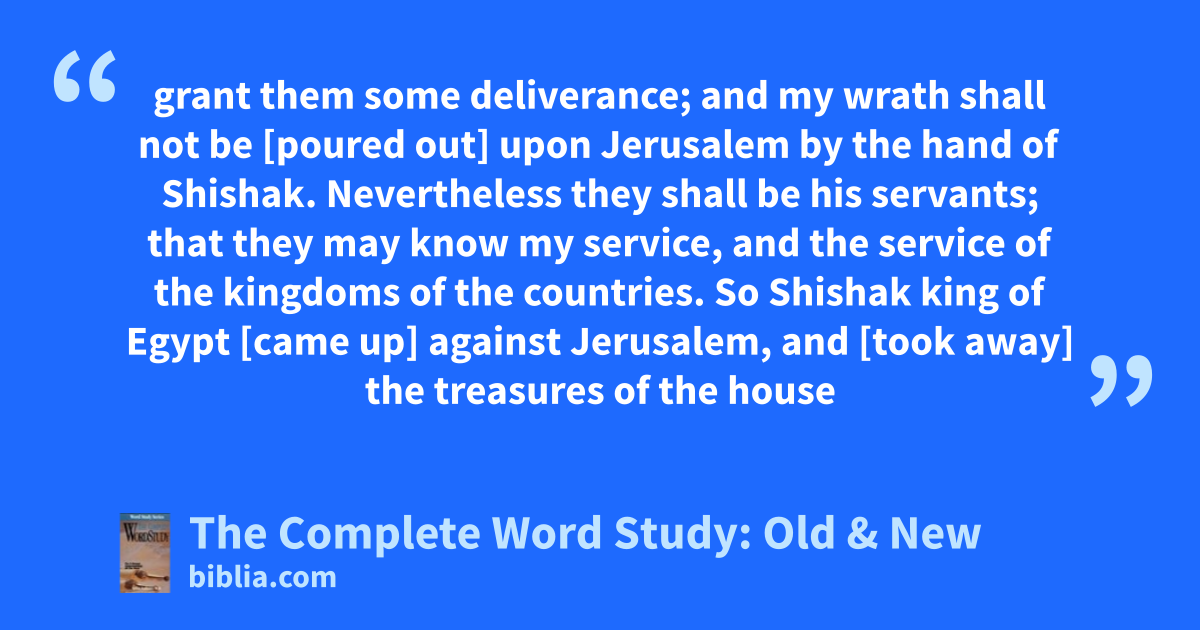 grant them some deliverance; and my wrath shall not be [poured out] upon Jerusalem by the hand of Shishak. Nevertheless they shall be his servants; that they may know my service, and the service of the kingdoms of the countries. So Shishak king of Egypt [came up] against Jerusalem, and [took away] the treasures of the house