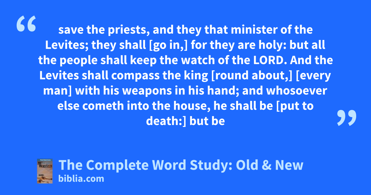 save the priests, and they that minister of the Levites; they shall [go in,] for they are holy: but all the people shall keep the watch of the LORD. And the Levites shall compass the king [round about,] [every man] with his weapons in his hand; and whosoever else cometh into the house, he shall be [put to death:] but be