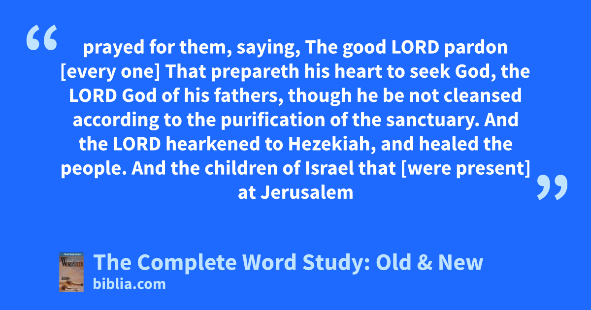 prayed for them, saying, The good LORD pardon [every one] That prepareth his heart to seek God, the LORD God of his fathers, though he be not cleansed according to the purification of the sanctuary. And the LORD hearkened to Hezekiah, and healed the people. And the children of Israel that [were present] at Jerusalem