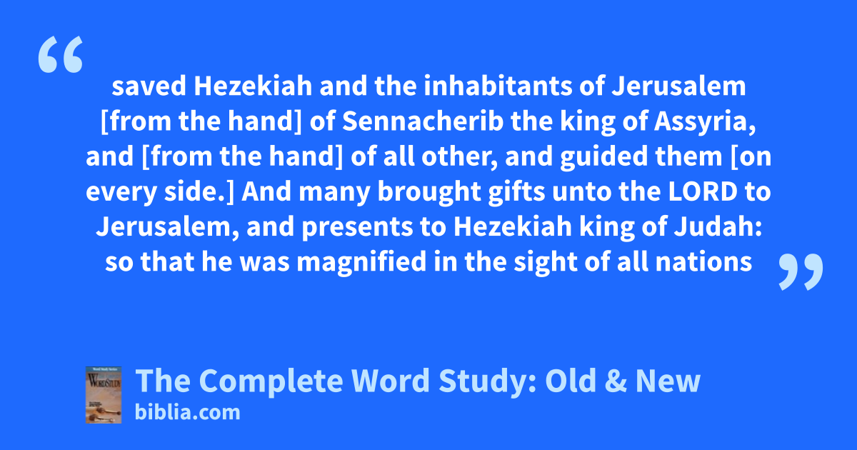 saved Hezekiah and the inhabitants of Jerusalem [from the hand] of Sennacherib the king of Assyria, and [from the hand] of all other, and guided them [on every side.] And many brought gifts unto the LORD to Jerusalem, and presents to Hezekiah king of Judah: so that he was magnified in the sight of all nations